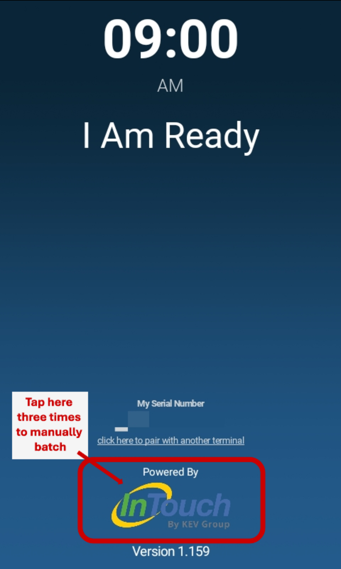 - Confirm that the KEV POS app is version 1.136 or later (check the bottom of the screen).