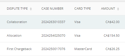 Here is an example of three different types of chargebacks showing on the Merchant Dashboard: