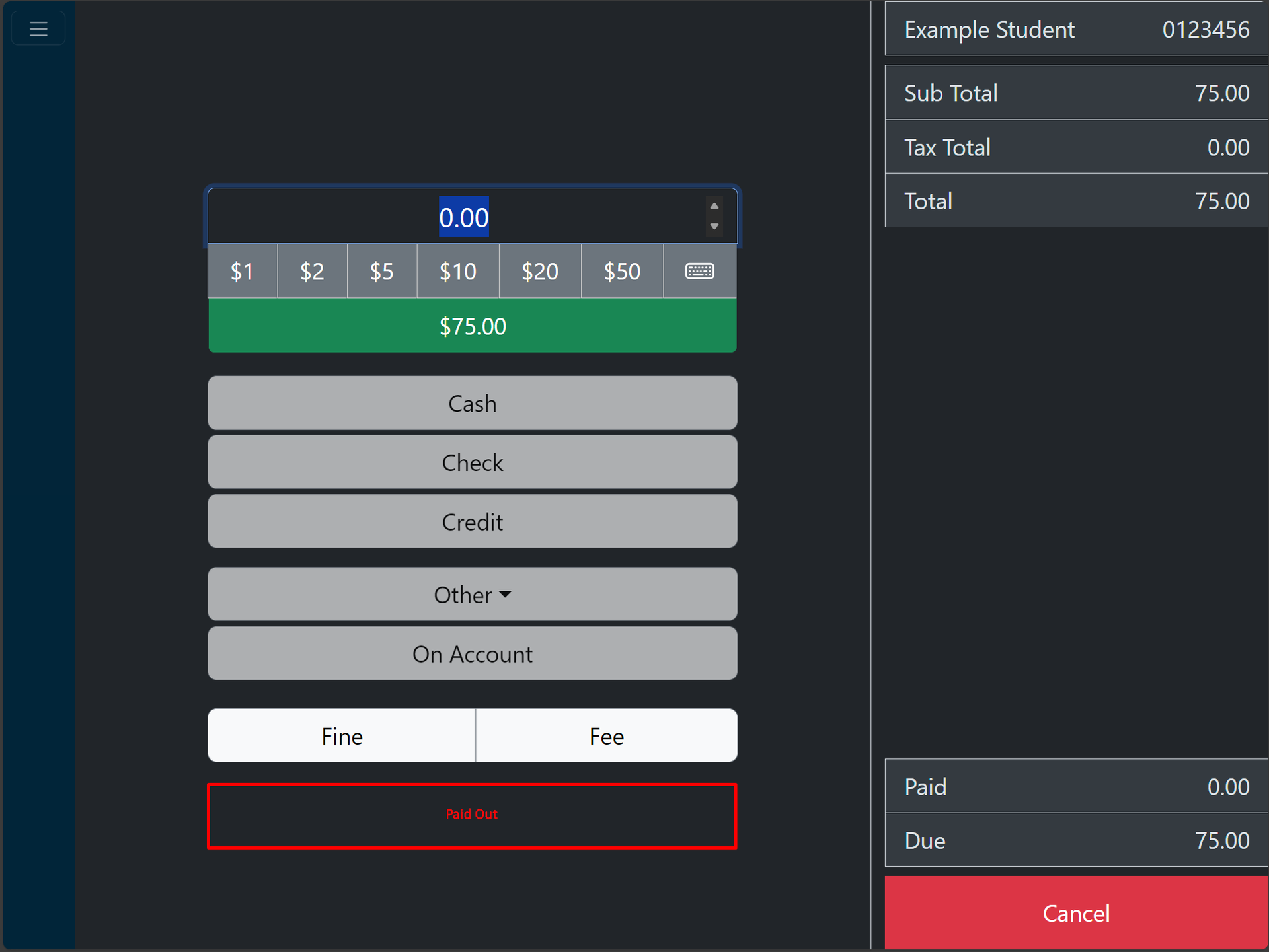 If the transaction total is less than or equal to the "Paid Out Limit," a Paid Out button will appear. This button allows the user to complete the transaction with a paid-out amount. However, the Paid Out button will be disabled if any payment method has already been used in the transaction, as Paid Out can only be applied independently without any other payment methods.