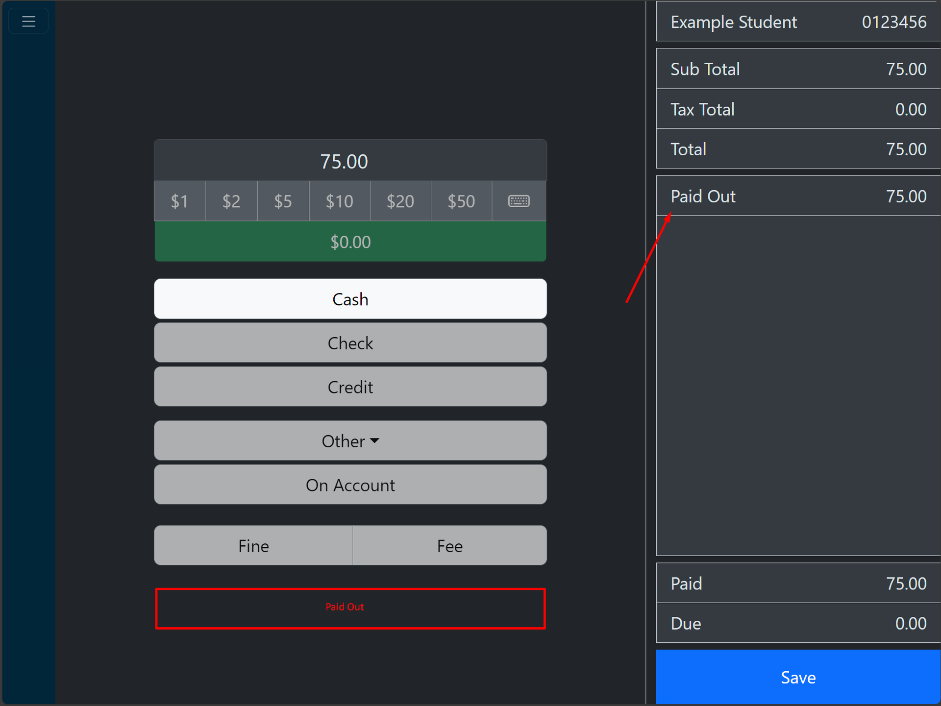 Clicking the Paid Out button will add a payment to the cart for the full amount of the transaction. Once this is done, the Save button will appear.