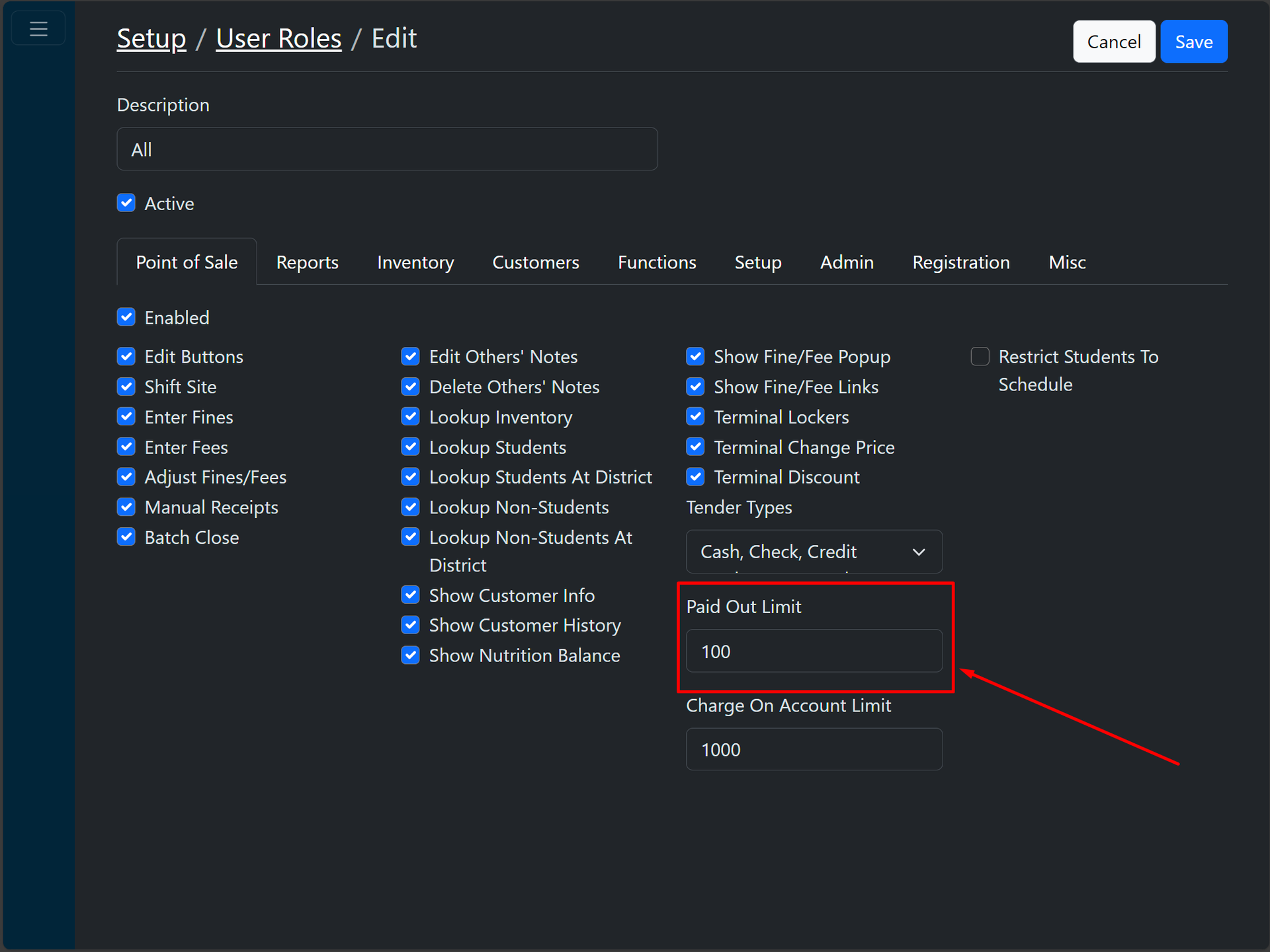Additionally, Paid Out amounts are subject to a limit based on the user’s role and the "Paid Out Limit" set for that role. This limit applies per receipt and varies depending on the site selected in the POS system.