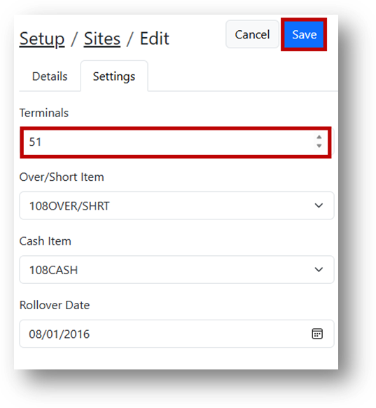 - Use the arrows to add or subtract terminals, or type in how many terminals you would like the site to have.