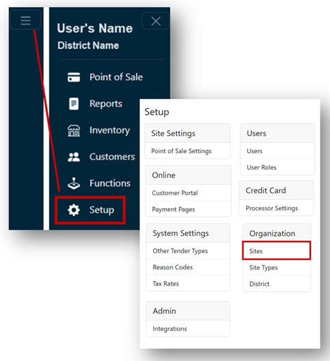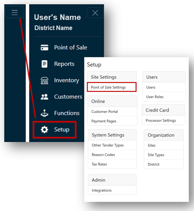 - Return to the Setup menu and click Point of Sale Settings under the Site Settings header.