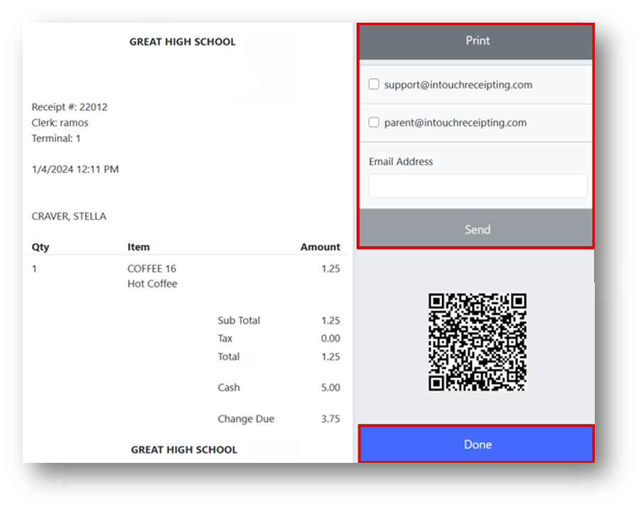 - Enter an email address and click Send to email the receipt.