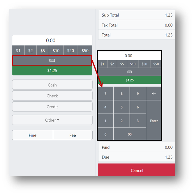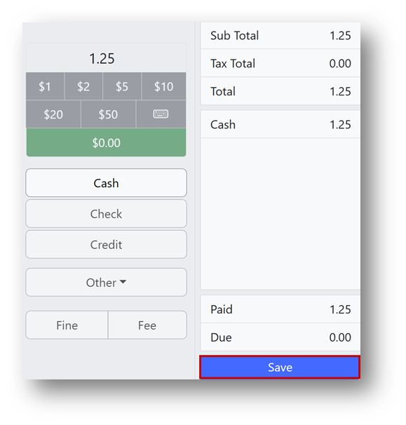 Note: After entering the cash amount, click Cash to change the red Cancel button into a blue Save button.