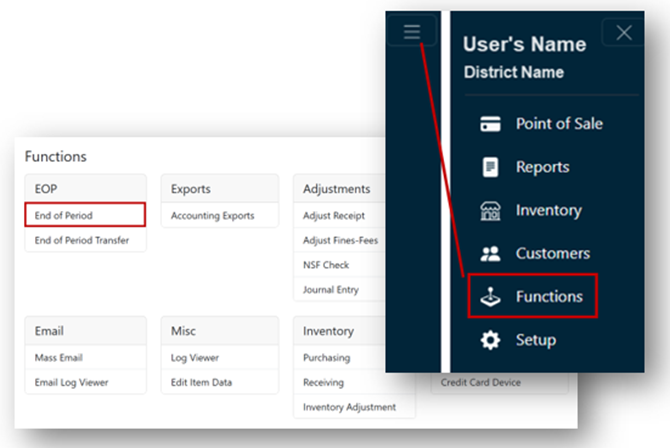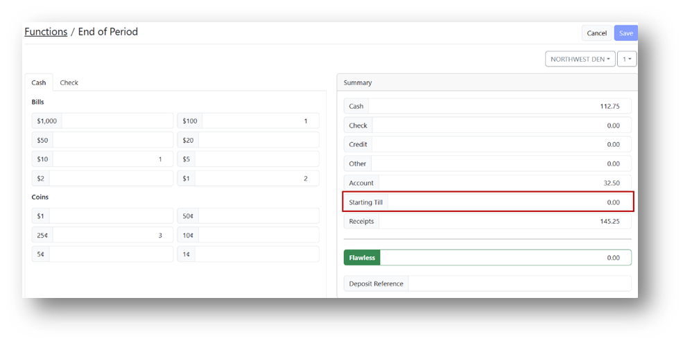 The End of Period main screen displays the cash declaration fields, check listing tab, tender listing, Starting Till, Receipts fields, balance, and Deposit Reference fields.