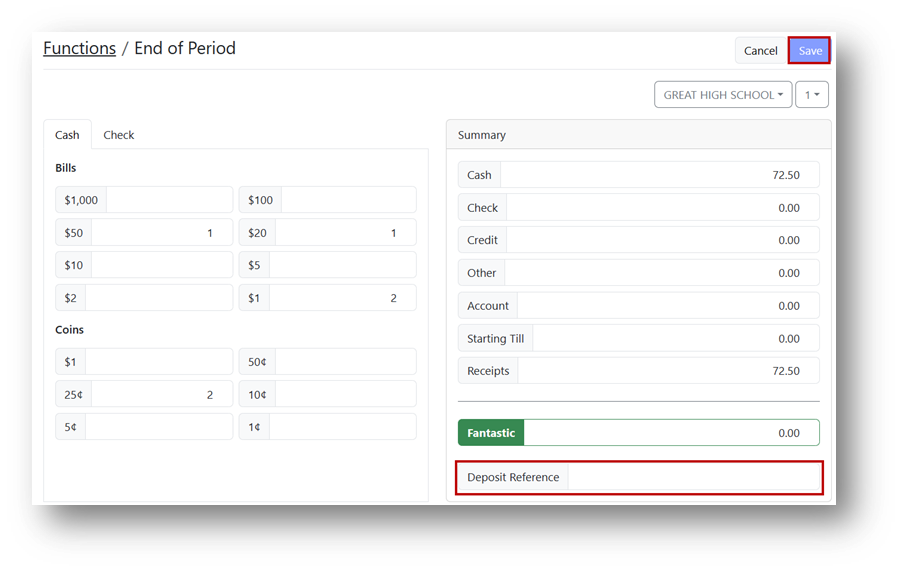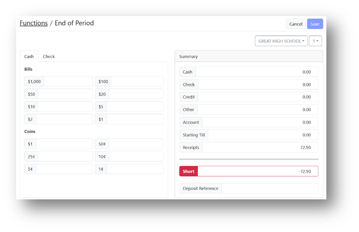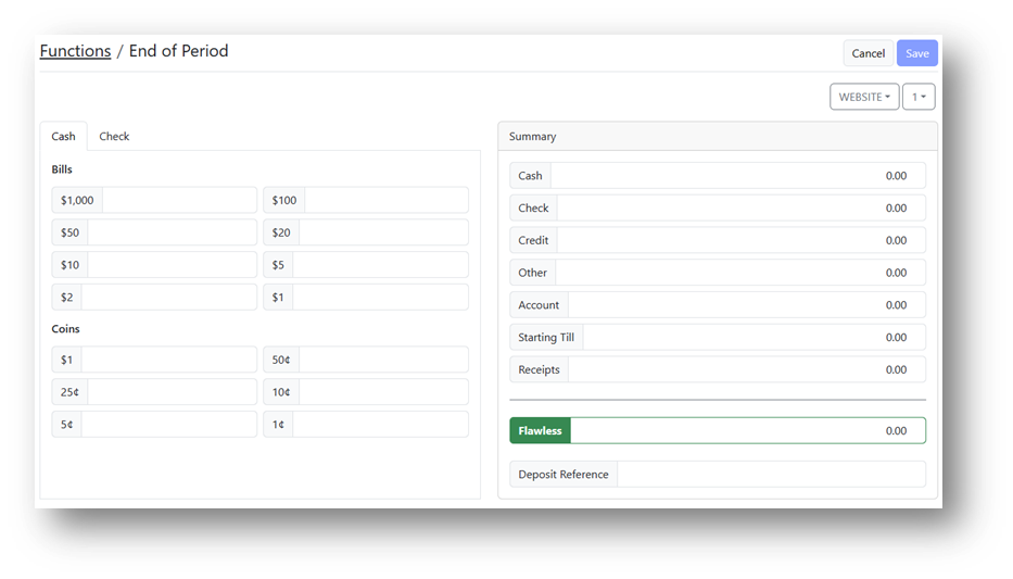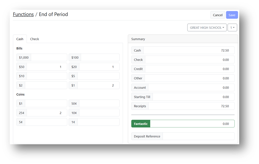 The Cash field under Summary will display the total cash as you enter counts. Credit and Check amounts are prefilled.
