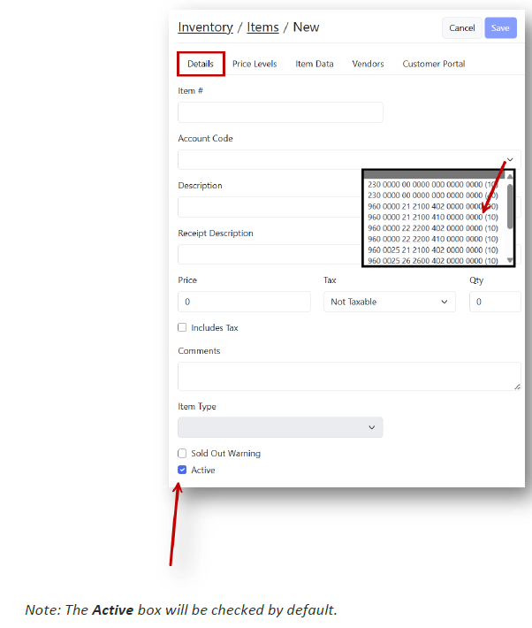 - Check the Sold Out Warning box if you would like a message to be displayed in the Point of Sale screen when the item's quantity is below ten (10).