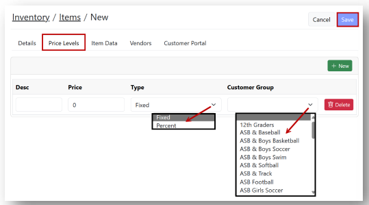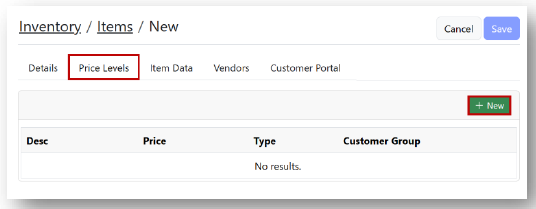 If you would like to add price levels to your Item, under the Price Levels tab, click + New.