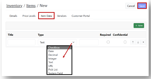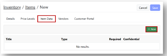 If you would like to add data elements to your item, under the Item Data tab, click + New.