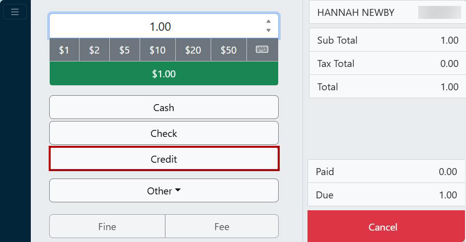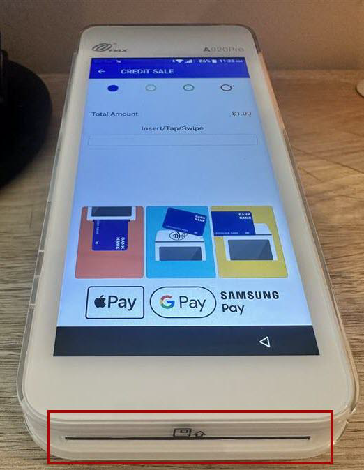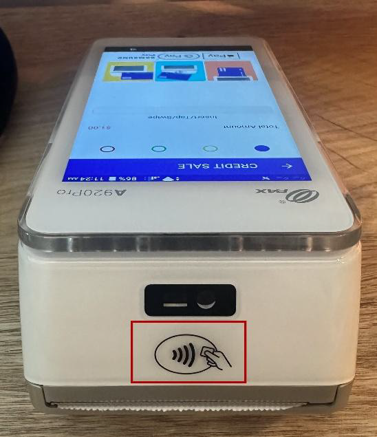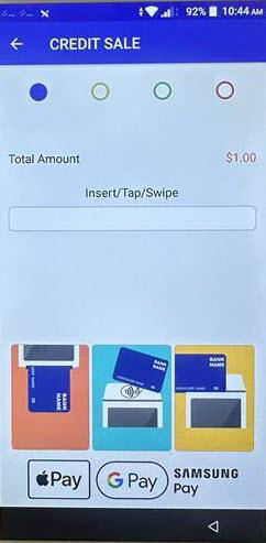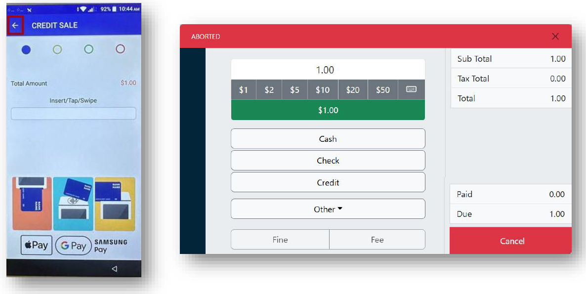 Note: To cancel the transaction, click the back arrow in the top left corner of the device. Once you have canceled the transaction, a red banner will appear across the top of the tender screen in InTouch Pay that says Aborted.