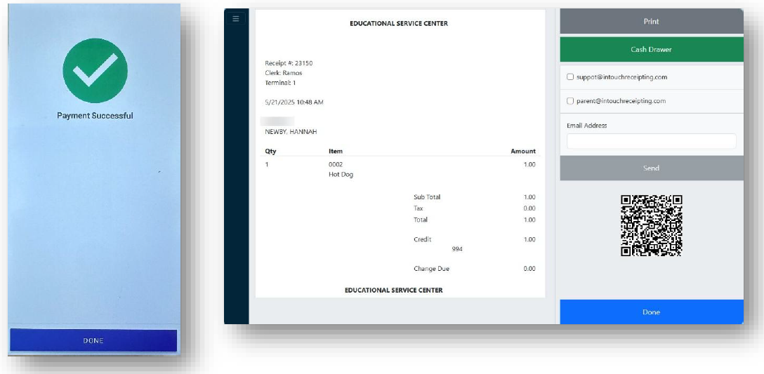 - You will receive a notification of successful payment on the PAX device and the customer's receipt will be generated in InTouch Pay. You can print or email the receipt, or have the customer scan the QR code, and click Done.